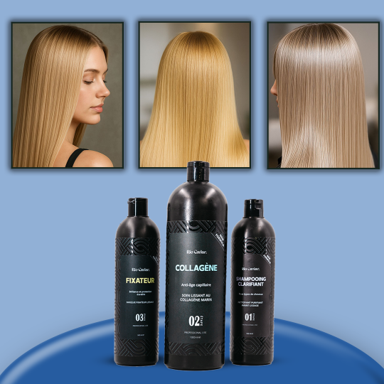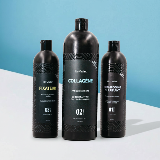 Pack Lissage Collagène (100 ml, 500 ml ou 1 L) : parfait pour cheveux fins, méchés ou endommagés, il apporte hydratation, brillance et protection.