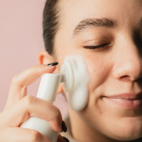 ضعي كمية صغيرة من الرغوة المنظفة على الوجه الرطب، دلكي برفق حتى تتكون الرغوة، ثم اشطفي جيداً بالماء.